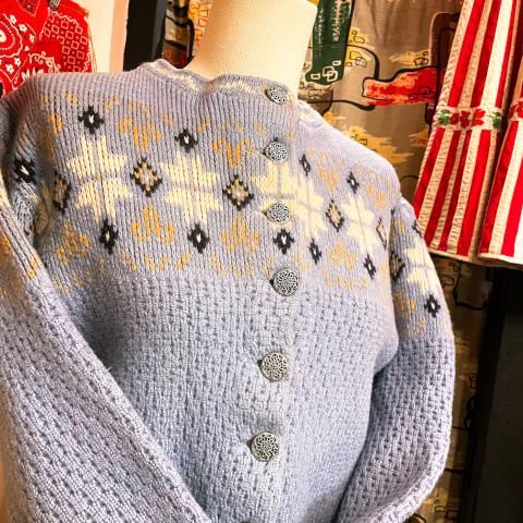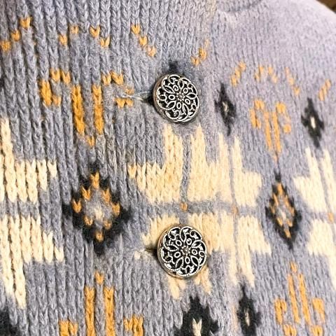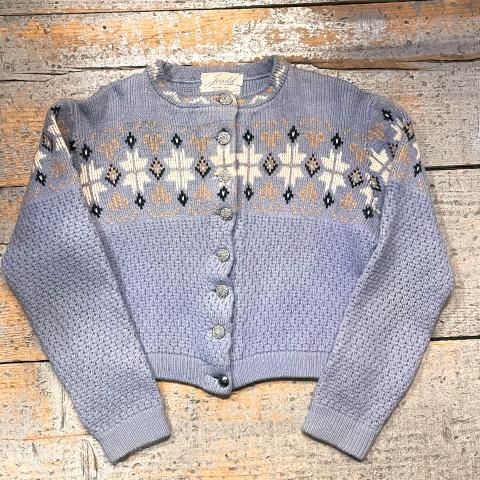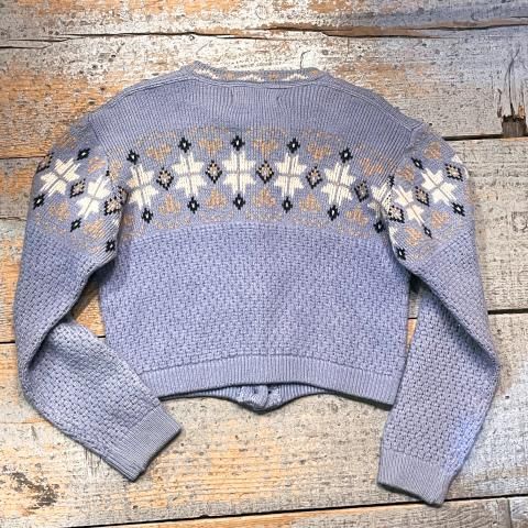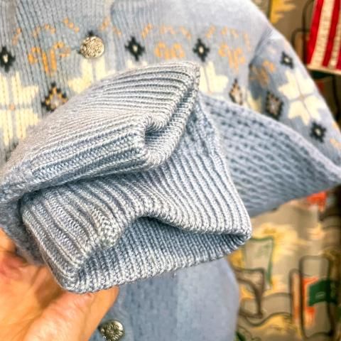 サックスブルー、少しくすみがかった水色のスノーフレークパターンのノルディックカーディガン*